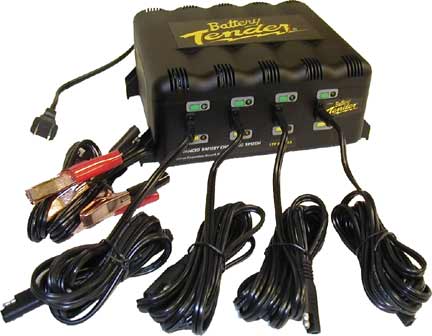 The 4 Bank Battery Tender Charging Station is four encased 1.25 amp battery chargers designed to fully charge a battery and maintain it at proper storage voltage without the damaging effects caused by trickle chargers. $259.95 US